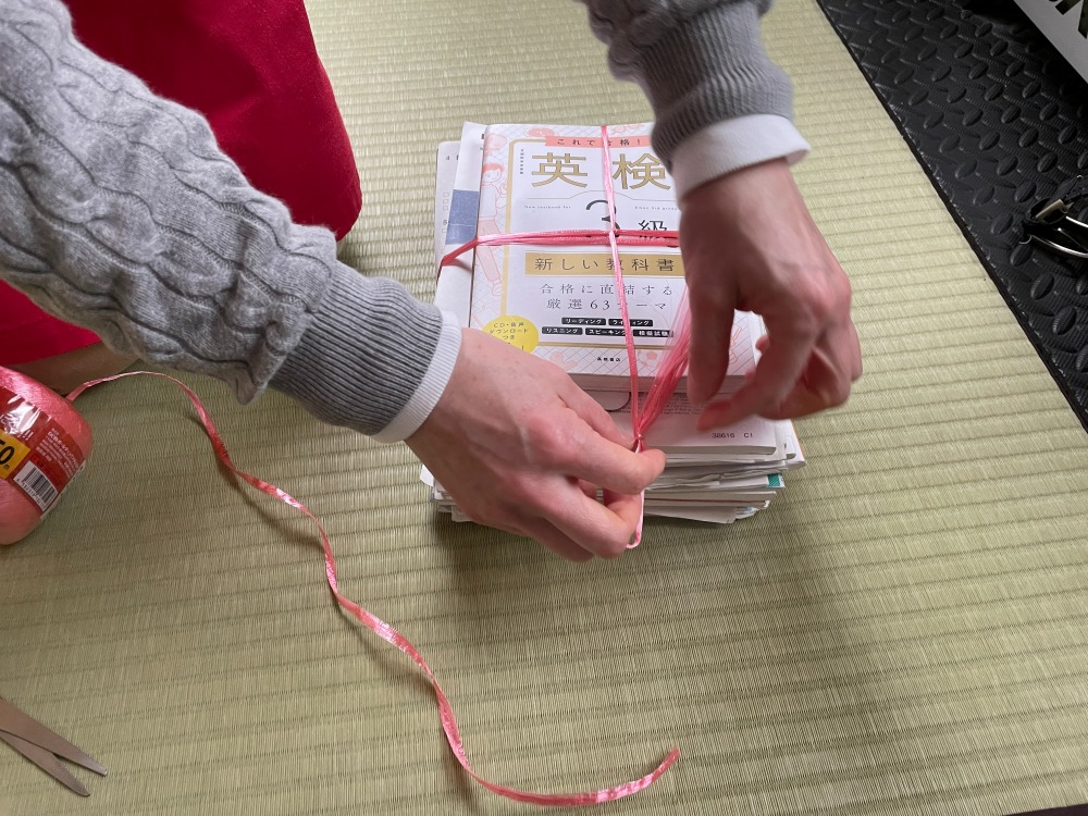 ちょうど大量に本があるタイミングにきくまるママンに来てもらったので、緩まずに束ねる方法を伝授してもらいましたよ!