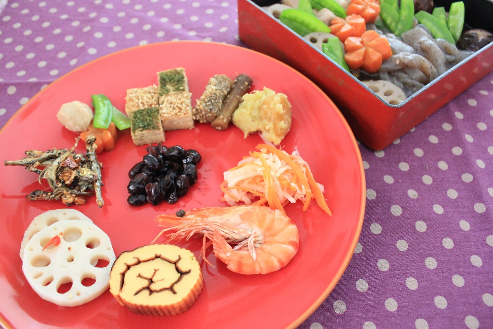 おせちの三段重には、一の重に黒豆や田作りのような前菜を、二の重は酢のものや焼き物を、三の重は煮物を詰めることが多いですが、一つのお皿に少しづつ置いても素敵です。